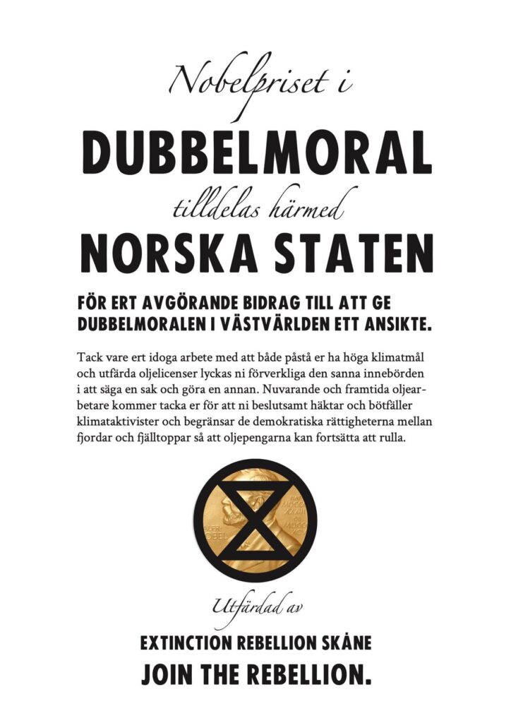 Extinction Rebellion Skåne delar ut nobelpriset i HYCKLERI till norska staten!