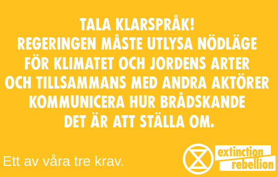 Krav 1: Tala klarspråk!Det är ett av våra tre krav till beslutsfattare: Regeringen måste utlysa nödläge för klimatet och jordens arter och tillsammans med andra… Läs mer »Tala klarspråk