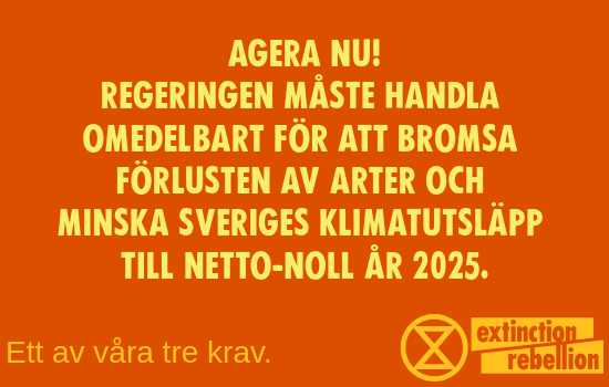UPPRORETS KRAV 3 KRAV:TALA KLARSPRÅK. Regeringen måste utlysa nödläge för klimatet och jordens arter och tillsammans med andra aktörer kommunicera hur brådskande det är att… Läs mer »Agera nu